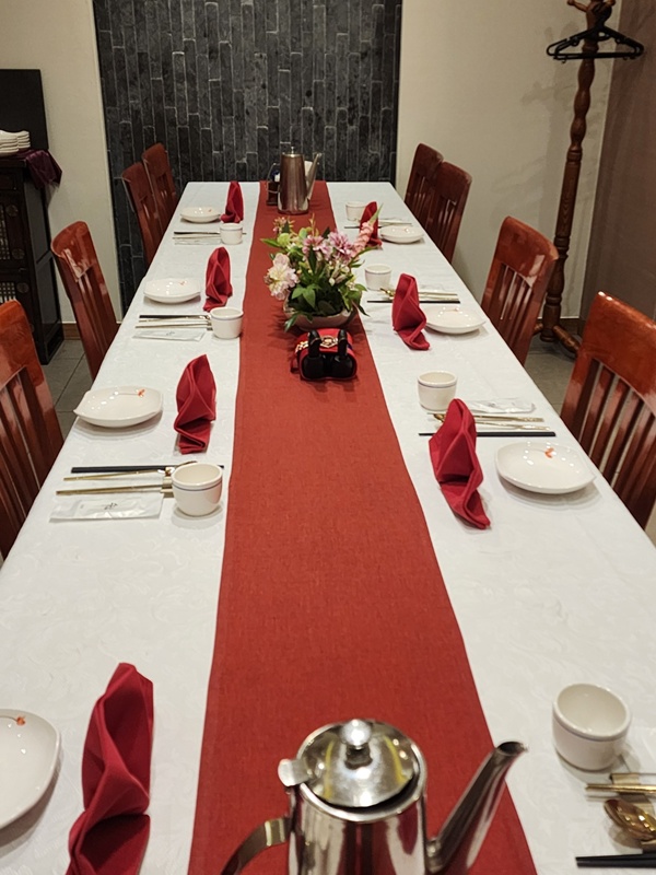 단정한 테이블 세팅 속 붉은 러너와 생화가