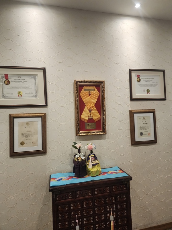 쉐프의 수상 이력과 인증서가 깔끔하게 전시되어 있습니다.