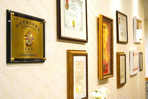 홀 한편의 벽면에는 한식 관련 상장과 인증서가 가득 걸려 있다.