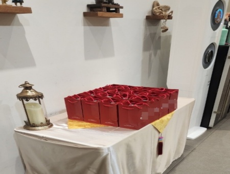 빨간 선물백들이 가지런히 놓인 모습을 보면,