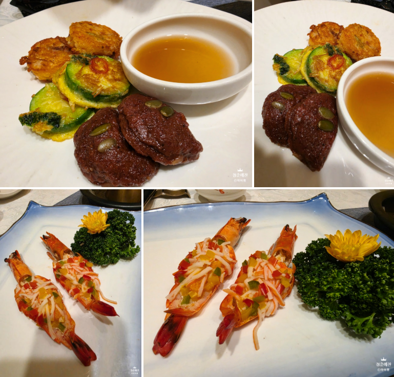 대하찜 요리로, 새우와 여러 재료를 한번에 맛볼 수 있었는데 깔끔하게 즐기기 좋았습니다.
