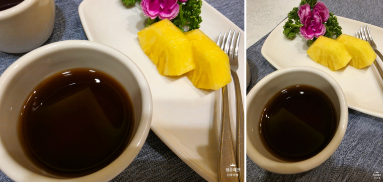 식사 후 깔끔하게 입가심할 수 있는 파인애플과 매실차가 디저트로 제공되었습니다