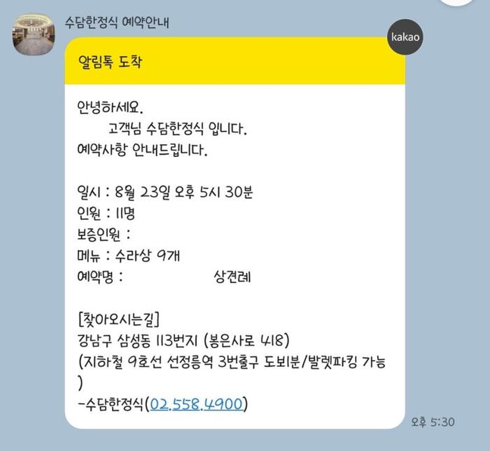 저흰 전화로 예약을 진행했고 예약이 완료되면,