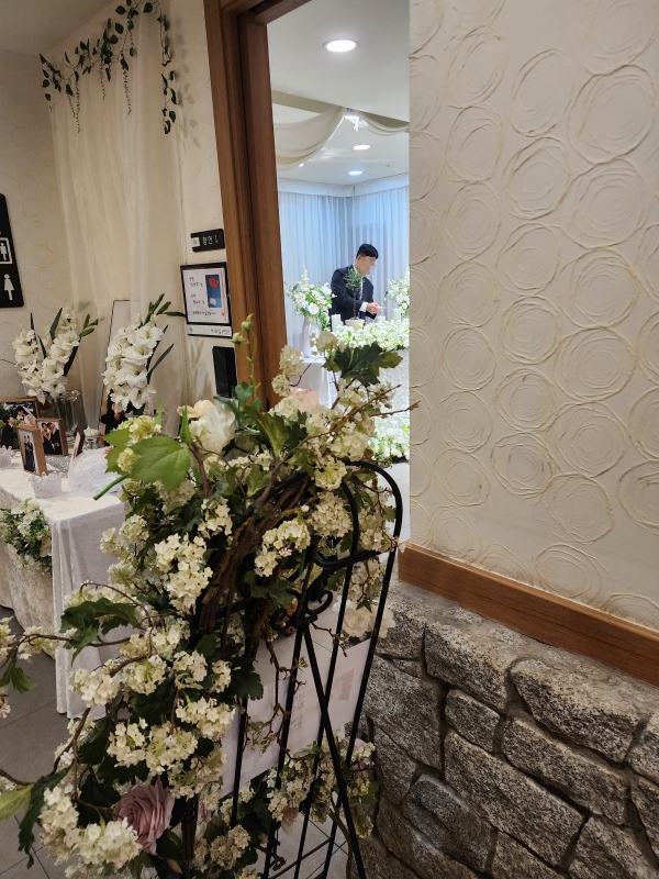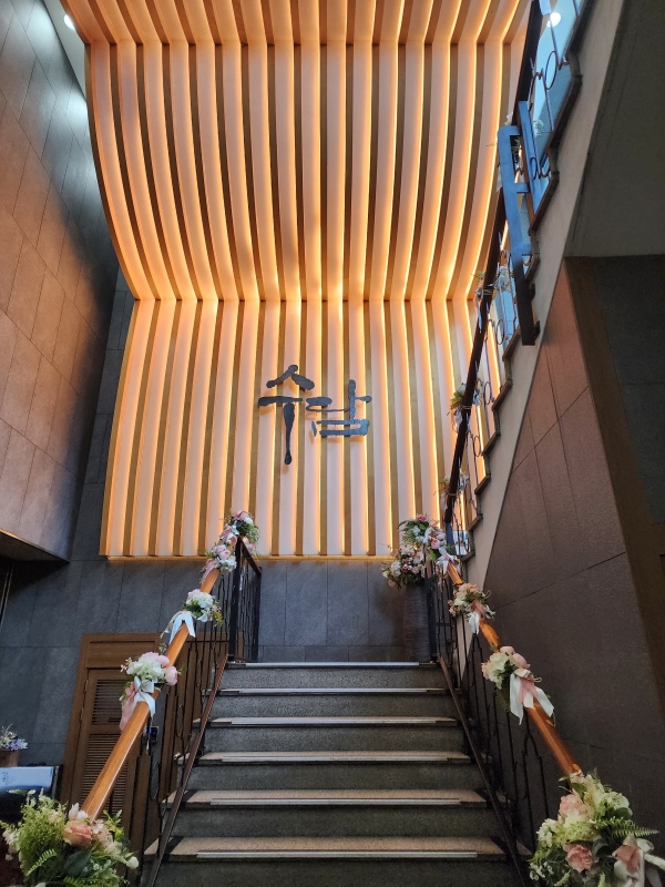 지하층으로 내려가는 계단은 웨딩 플라워로 가득해,