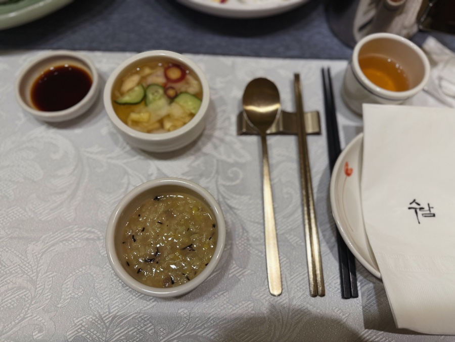 식전에는 죽과 물김치가 먼저 차려지더라고요. 물김치가 정말 시원하다며 친정아빠께서 한 그릇을 금세 비우셨는데, 직원분께서 다음 요리를 내어주시며 바로 새로 가져다주셨답니다. 죽도 담백해 식전 허기를 달래기에 딱 좋았어요.