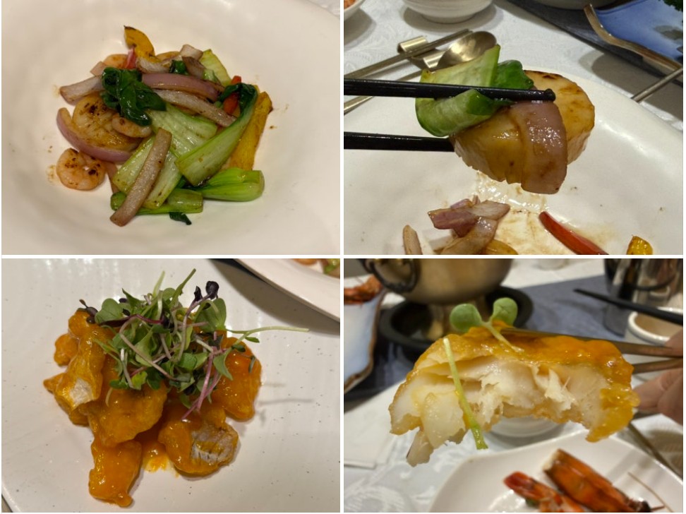 뒤이어 해산물 볶음과 대구튀김이 차례로 나왔어요. 관자와 새우를 비롯해 청경채, 파프리카, 양파 등을 센 불에 재빨리 볶아내 살짝 불향이 감돌던 해산물 볶음은 재료 본연의 맛이 살아 있어 더욱 매력적이었답니다.