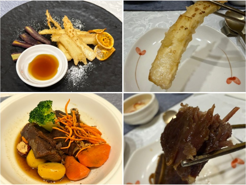 특히 계절 특선 요리인 수삼튀김은 정말 인상적이었는데요. 쌉쌀한 수삼을 바삭하게 튀겨 달콤한 홍삼청에 찍어 먹으니, 마치 보약 한 첩을 먹는 듯 몸이 건강해지는 기분이 들었거든요. 곁들여 나온 자색당근까지 더해져 색감과 영양을 모두 챙긴 메뉴였어요.